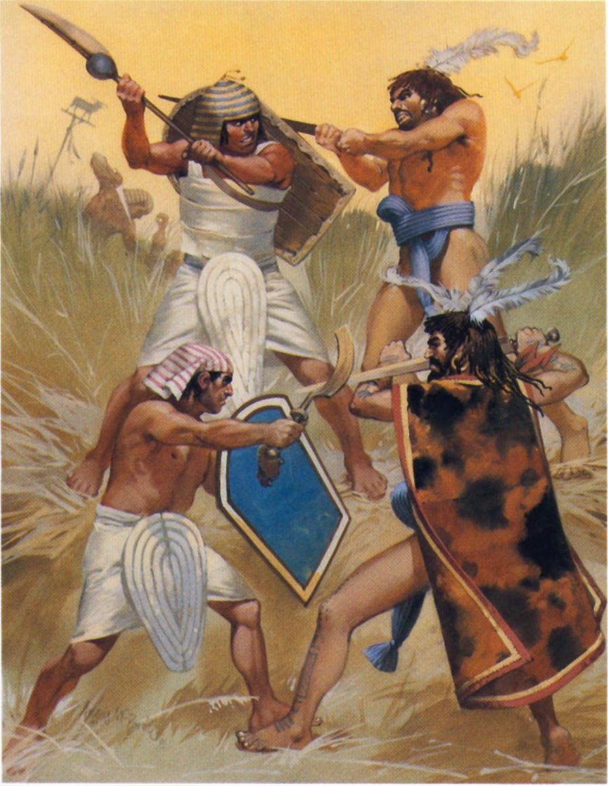 Họ đến để định cư vì họ mang theo cả gia đình và xây dựng pháo đài và công sự. Những bộ lạc Bắc phi bản địa thuộc cổ vương quốc Ai Cập (người Libu, Meshwesh và Kehek) đã liên minh với những kẻ mà về nguồn gốc được cho là xuất phát từ bờ biển Aeean và Tiểu Á. Những người này bao gồm cả dân Sherden, Sheklesh, Lukka, Tursha, Akawasha. Những người này đã thâm nhập sâu vào Ai Cập đến tận ốc đảo Farafra và và Canopic ở ven bờ sông Nile trước khi pharaoh đánh bại họ.