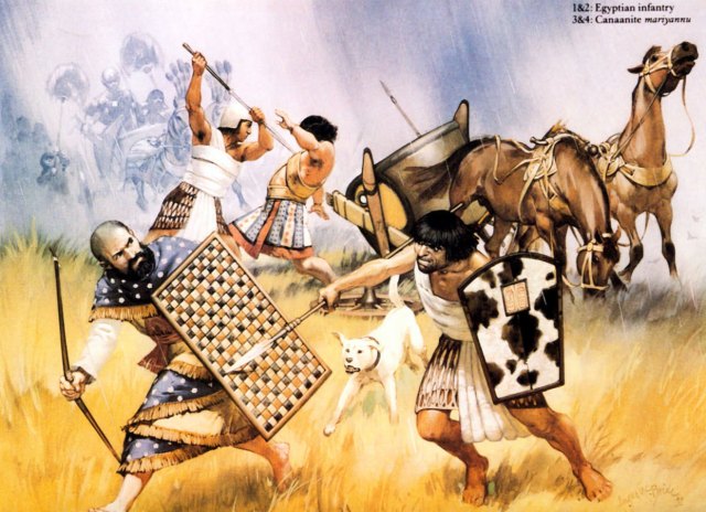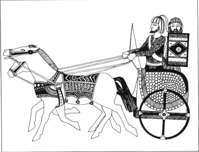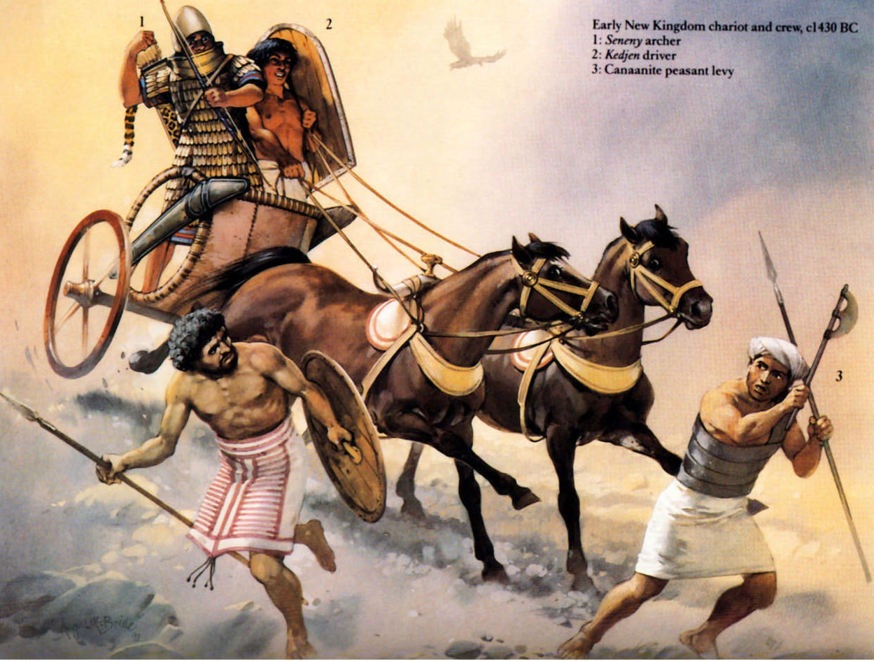 Hính 14: Lực lượng tinh nhuệ của các thành bang Canaanite là loại quân chiến xa gọi là chiến sĩ mariyannu. Đây là hình ảnh minh họa lấy từ bản khắc chiến xa của Tuthmosis IV, cho thấy những yếu tố chính của trang bị và lính trên một chiến xa ngựa kéo.
