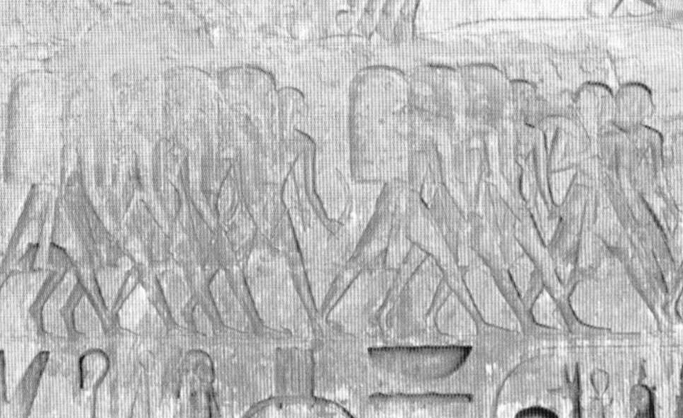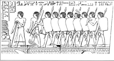 hinh 10 : bản khắc đá này miêu tả những chiến sĩ trong trận Qadesh, khác với những hình ảnh sơm hơn các chiến sĩ trong hình đều có khăn đội đầu, một số vẫn sử dụng rìu đồng nhưng một số được trang bị thanh kiếm quodesh ngoài khiên và giáo.