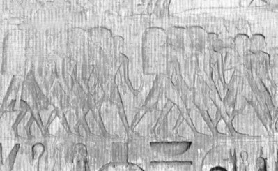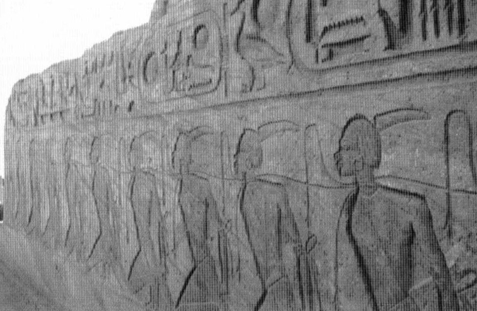 Hình 32: bức họa ở beit-al-Wali vùng Nubia cho thấy một vị hoàng tử (có thể là Ramases II) mang những kẻ bị chinh phục tới trình diện Seti, hầu hết tù bình là người Syria và Canaanite duy có người cuối cùng là người Libya.
