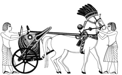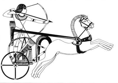 hình 11: từ khi đẩy lùi người Hyksos cho đến giữa thế kỷ 14 BC, chiến xa của người Ai cập tương đồng với những dân tộc Canaanite . Đặc trưng của những kiến xa ngựa kéo cho tới tận vương triều của Tuthmosis IV là bánh xe có 4 nan hoa . Dù chiến xa được đóng tại Ai cập nhưng một lượng lớn của chúng là cống phẩm của các thành bang chư hầu Canaanite. Kị sĩ trong hình đang dùng chiến xa đi săn, anh ta quấn dây cương ngang lưng để rảnh 2 tay dùng kéo cung.