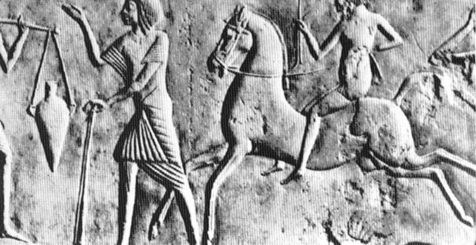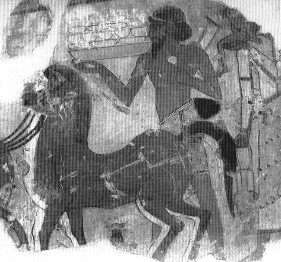 Hình 17 : Tương phản với bức tượng trên là hình ảnh khắc trong mộ ở Horemhab, kị sĩ trên được cho là đang ngồi trên “ghế của con lừa “ cưỡi ngựa không mang yên.