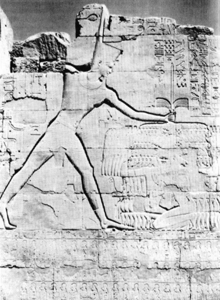 Hình 15 : Hình khắc đá tại đến Amun ở Karnak mô tả Tuthmosis trong một hình ảnh biểu trưng đang túm tóc của các thành bang Canaanite mà ông ta bắt làm tù binh sau chiến dịch của mình