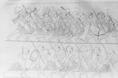 Hình 24: Những chi tiết trong bức họa dưới đây ở đền Amarna có nhiều điểm đáng chú ý: đầu tiên là 4 người lính bên phải ngoài cùng là hình ảnh của lính đánh thuê nước ngoài trong quân đội Ai Cập, hàng quân còn lại mang những cờ hiệu dùng để phân biệt nhanh các đại đội, hàng quân bên dưới là những lính bộ binh trang bị vũ khí cận chiến.
