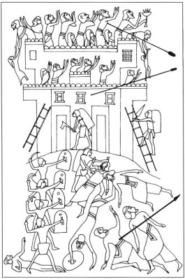Hình 32a: Kỹ thuật công thành của người Ai Cập trong giai đoạn này được mô tả rõ ràng torng bản khắc đá này. Nó cho thấy những giai đoạn khác nhau của trận chiến. Đầu tiên bên dưới là cảnh lính bộ quét sạch quân phòng thủ tường thành của đối phương. Phía trên là cảnh lính công thành bằng thang, họ treo khiên ngược ra sau lưng để bảo vệ và được cung thủ bắn vào thành yểm trợ. Một số khác đang cố phá cổng thành bằng rìu .