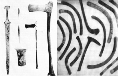 Hình 7 : Vũ khí của bộ binh Ai Cập đầu vương triều thứ 18. Vũ khí tấn công chủ đạo là cây búa đồng. Thanh dao dài bằng đông bên trai là vũ khí trong gia đoạn chuyển tiếp trước khi quân Ai Cập chuyển hẳn sang dùng kiếm dài do chịu ảnh hương từ lính đánh thuê Sherden đến từ biển.
