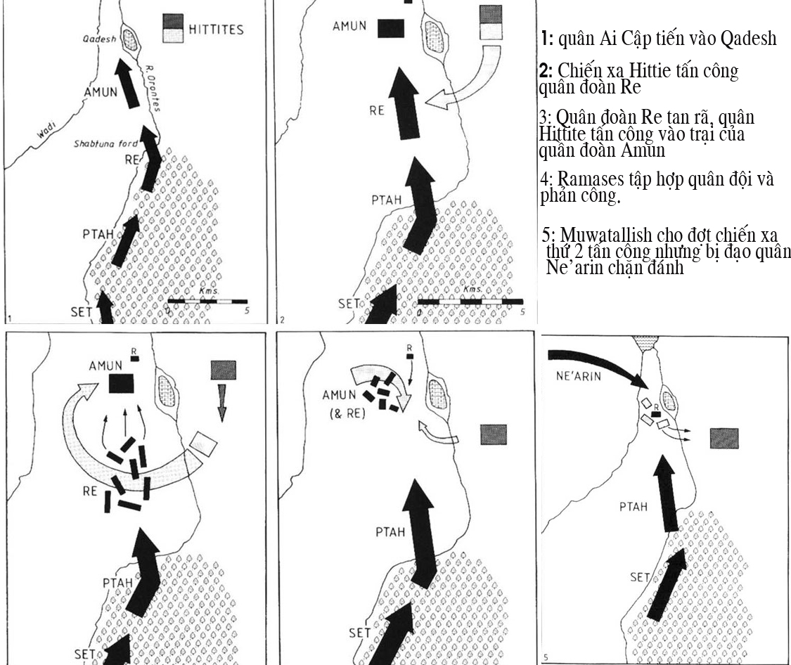 Phản ứng của vị pharaoh lòng đầy hoài nghi là cho gọi một cuộc thảo luận khẩn với các sĩ quan cấp và kết quả là lệnh triệu hồi ngay lập tức các quân đoàn Pta, Set đến Qadesh. Trong lúc chờ 2 quân đoàn này tới thì Ramases phải dựa vào lực lượng của 2 quân đoàn Amun và Re để chống lại cuộc tập kích bất ngờ của quân Hittite. Nhưng đây là điểm mang lại thất vọng cho vị pharaoh. Ngay lúc quân đoàn Re băng qua đồng bằng để đến vị trí trại của Amun thì Amuwallish ra lệnh tấn công từ bên cánh của đạo quân đang di chuyển.