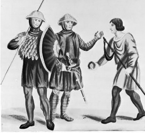 Người lính giáo với khiên tròn và nón rộng vành, mặc giáp vảy cá gọn nhẹ và linh hoạt hơn giáp lưới xích, vẫn được phục vụ giữa các đơn vị lính bộ binh cho đến năm 1325. Người lính bộ binh mặc giáp lưới xích (họa sĩ dùng chữ số một để thể hiện cho giáp lưới xích), vớ bằng lưới xích, giáp đầu gối bằng sắt để bảo vệ. Người lính ném đá của đầu thế kỷ 14 hoàn toàn không mặc giáp, dùng cây gậy để ném những cục đá to. Khoảng cách thông thường của gậy ném đá là 275 yard (~251m).