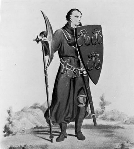 Robert Rouse, bá tước xứ Watre ở Yorkshire, năm 1300. Áo giáp của ông ta được che phủ bởi áo khoác ngoài và có giáp bảo vệ đầu gối. Cây rìu lớn là loại vũ khí của Đông Âu. Nó không được ưa thích và không được dùng cho lính bộ binh cho đến dến năm 1450, dù nó đã được trang bị cho một số đơn vị bộ binh trong thế kỷ 14.