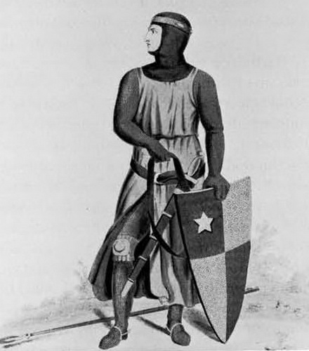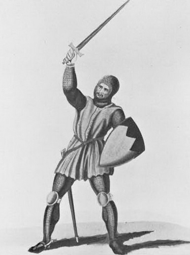 Một hiệp sĩ của một một tư đầu thế kỷ 14, vũ trang với một cây kiếm, chùy và dao. Phần giáp bên dưới áo lưới xích trông giống như váy được làm bằng vải thô và cotton, có tác dụng là giáp hỗ trợ vào ngăn không cho những mảnh vỡ rỡi ra có thể tạo nên những vết thương