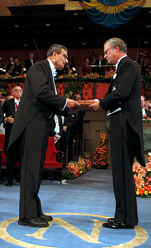 Amartya Sen đang nhận giải thưởng từ tay vua trao Photo: Anders Wiklund