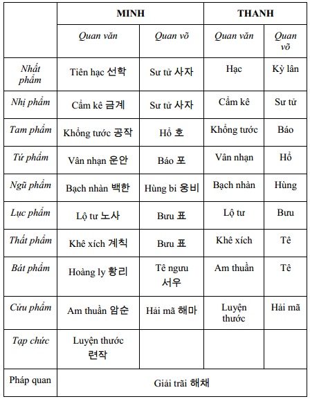 Bảng 1: Quy chế Hung bối – Bổ tử của nhà Minh và nhà Thanh Trung Quốc (theo Minh sử và Thanh sử)