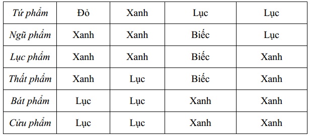 Tại Việt Nam, từ năm 1428 đến năm 1437, Thường phục của bá quan thời Lê sơ vẫn áp dụng chế độ thời Trần – Hồ. Theo đó, “quan Nhất phẩm áo màu tía; Nhị phẩm áo màu Đại hồng (tức màu đỏ); Tam phẩm màu Đào hồng (tức màu hồng); Tứ phẩm màu lục; Ngũ – Lục –Thất phẩm, áo màu biếc; Bát – Cửu phẩm màu xanh.”9