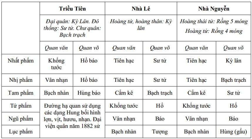 Phẩm trật của bá quan một mặt được phân biệt dựa trên phục sắc, một mặt tiếp tục được khu biệt dựa vào hình thêu muông thú trên áo bào. Chính bởi sự khu biệt tinh tế này, triều đình Lê Nguyễn Việt Nam, Triều Tiên Hàn Quốc và nhà Thanh Trung Quốc sau này đều tham chước mô phỏng, tạo nên cục diện văn hiến áo mão (衣冠文獻 의관문현) tương đồng giữa các nước Trung, Việt, Hàn trải suốt từ thế kỷ XV đến đầu thế kỷ XX (xem Bảng 1).