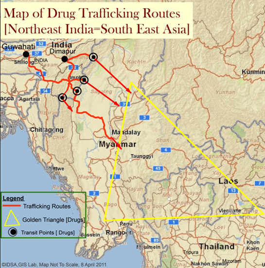 Nhưng mặc dù chính phủ quân phiệt luôn chối là không còn trồng cũng như buôn bán thuốc phiện. Thật sự chúng chỉ đổi phương tiện và con đường chuyển vận mà thôi. Hiện Tam Giác Vàng vẫn sản xuất 3000 tấn thuốc phiện mỗi năm, chiếm 60% lượng cung cấp cả thị trường thế giới. Trước đây héroin từ Miến sang Thái Lan và Vân Nam rồi chuyển đi khăp nơi. Nay thì bọn buôn lậu đã đổi hướng, dùng quốc lộ 39 của Ấn Ðộ, chạy dọc theo biên giới Ấn-Miến dài 1643 km, qua những khu rừng già dưới rặng Hy Mã Lạp Sơn, không ai có thể kiểm soát được. Ðặc biệt bọn buôn lậu ngày nay mang thuốc phiện từ Tam Giác Vàng tới biên giới Ấn và mua các hóa chất tại đây để tinh chế thành héroin vừa rẽ lại tiện lợi. Sau đó bột trắng được tiêu thụ khắp các thành phố lớn tại Ấn, Tích Lan. Hồi Quốc, Trung Ðông, Âu Châu và Hoa Kỳ. Tham gia vào việc buôn ban này ngoài viên chức và quân đội Miến còn có chính quyền Ấn ở các tiểu bang miền đông. Tóm lại nói gì chăng nữa thì lượng sản xuất thuốc phiện tại Miến Ðiện cứ tăng trưởng hằng năm trên 10%. Góp phần vào việc chuyển vận ma tuý khắp thế giới là các tổ chức của người Wa và Shan cùng với quân đội Miến .