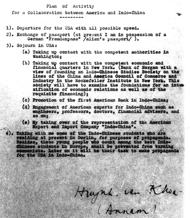 Rồi có một trường hợp thú vị là Huynh Van Khoa (Huỳnh Văn Khoa?), một người Việt Nam sống ở Berlin vào tháng 7 năm 1945 đã viết 2 tài liệu bằng tiếng Đức: “Vorschläge für eine Zusammenarbeit zwischen Amerika und Indochina” (Proposals for Cooperation Between America and Indochina – Kế hoạch hợp tác giữa Mỹ và Đông Dương) and “Die Wirtschaft Indochinas” (The Economy of Indochina – Nền kinh tế Đông Dương).