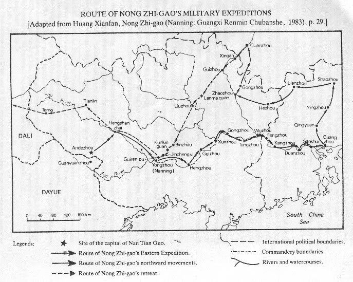 Tại Yong (Ung), Nông Trí Cao tức thời khởi sự đóng thuyền, loan bố ý định của anh ta nhằm tái tấn công thành phố Quảng Châu và thành lập quốc gia Nam Việt tai đó. Một loạt các lực lượng quân Tống được phái đến để đánh anh ta, nhưng anh ta đánh bại họ trong vùng núi đồi bao quanh Yong. Anh ta đã hạ sát năm vị chỉ huy đầu tiên được phái đến đánh anh ta bởi triều đình. Hoàng Đế [Trung Hoa] đã phái Địch Thanh (Di Qing) [có kèm chữ Hán, chú của người dịch], một quân nhân chuyên nghiệp thuộc tỉnh Sơn Tây, một môn đệ của các binh pháp nhà Tần và nhà Hán, người đã chinh chiến qua 25 trận trong 4 năm chống lại xứ Tây hạ (Xi-xia) (63). Địch Thanh được ủy toàn quyền và đã gom góp 31,000 quân và 32 vị tướng tại tỉnh Hồ Nam. Ông trưng tập đội kỵ binh thiện chiến của bộ lạc Fan-luo [có kèm chữ Hán, chú của người dịch] từ miền Đông Bắc, đội quân được nói là “Họ có thể leo lên hay xuống núi như thể đi trên đất bằng” (64)