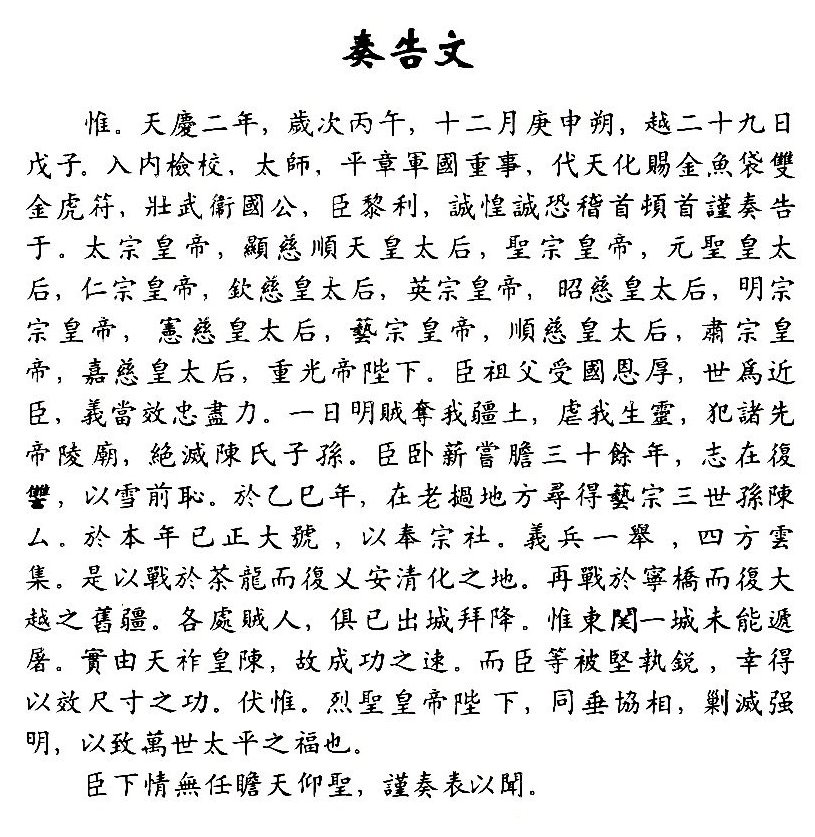 Năm thứ 2 niên-hiệu Thiên-khánh là năm Bính-ngọ (1426), tháng chạp, quá ngày Canh-thân là ngày sóc (mồng một) đến ngày 29 là ngày Mậu-tí, tôi là Lê-Lợi, giữ chức Nhập nội kiểm-hiệu Thái-sư, coi các việc trọng về Nước, về quân, thay Trời giáo-hóa, đeo đãy Cá vàng, mang phù Hai hổ vàng, tước Tráng-vũ Vệ-quốc công (7),