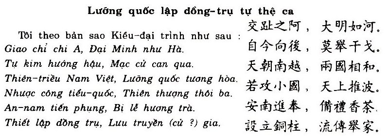 Tôi dịch ý như sau : bài ca thề khắc trên cột đồng dựng lên bởi hai nước : Giao-chỉ là Núi, Đại Minh là Sông (ý : thề sông cạn núi mòn). Từ rày về sau, không gây chiến tranh. Hai bên Thiên-triều và Nam-Việt, Hai nước hòa cùng nhau. Nếu đánh nước nhỏ, trên Trời sẽ nổi cơn giận mà trừng trị. An-nam sẽ dâng cống, sắm đủ hương trà. Vậy dựng cột đồng, để lưu truyền trong mọi nhà (đồng trụ cũng như thiết khoán là vật bền để khắc lời thề cho giữ được lâu dài)