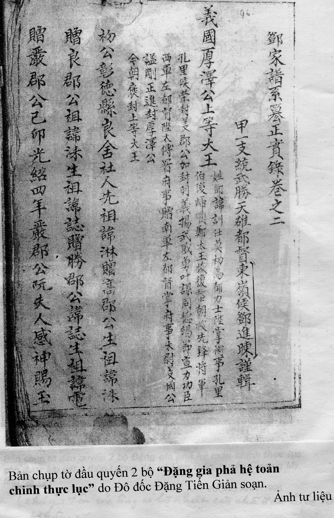 Ảnh chụp trang đầu quyển 2 bộ “Đặng gia phả hệ toản chính thực lục”minh chứng cho tác giả biên soạn là Đô đốc”Đông Lĩnh hầu Đặng Tiến Giản”. (Chữ Hán 東 嶺 侯  鄧 進 暕.Rất dễ phân biệt chữ Đông ‘東’ đứng đầu tước Đông Lĩnh hầu với chữ Giản ‘暕’ họ tên Đặng Tiến Giản).