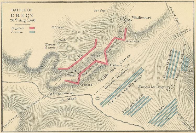 Người ta cho rằng sau khi hạm đội của Edward khởi hành quay trở về nhà thì nó đã được chất đầy chiến lợi phẩm sau sự sụp đổ của thành phố Caen, ông ta đã không còn sự lựa chọn nào khác ngoài việc hành quân bộ đối để đến địa điểm có đồ cung cấp mà ông ta hy vọng sẽ gặp chúng tại La Crotoy tại Ponthieu. Dường như là Edward III không muốn đánh một trận lớn với Philip cho đến khi ông liên kết với những đồng minh người Fleming, do đó, việc phải rút lui sẽ là những tin tức khó chịu nhất. Tuy nhiên một khi không thể tránh khỏi một trận chiến, thì kế hoạch của Edward III là rõ ràng ông rằng muốn đánh nhau với các kỵ binh Pháp hơn là bộ binh của họ. Do đó, ông ta đã tìm cách kích động để đối phương tung ra các đợt tấn công bằng kỵ binh ngược từ dưới thấp lên trên cao vào những đội hình bộ binh phòng ngự được chuẩn bị tốt. Một khi cuộc tấn công của người Genova bị đánh bại thì tất nhiên là chính xác những gì Edward III mong muốn đã xảy ra.