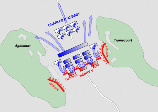 Cho đến nay các mô tả về cuộc tấn công vào đạo hậu quân ở Agincourt được định giá bề mặt từ các sử gia đương đại: đó là một cuộc tấn công bột phát bởi một lãnh chúa địa phương tham lam. Nhưng nó cũng rất phù hợp với kế hoạch ban đầu của người Pháp. Họ ( các chỉ huy chiến trường của Pháp ) đã dự kiến một cuộc tấn công sâu rộng khoảng trên bên trái ở phía sau quân Anh, kết hợp với các đợt tấn công bằng kỵ binh vào cánh phải của nó. Chúng tôi không được biết khi nào cuộc tấn công vào doanh trại của quân Anh đã nổ ra.