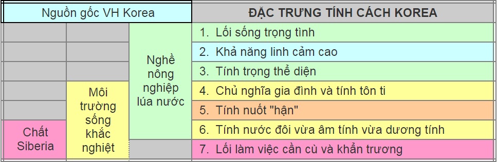 Hệ thống bảy đặc trưng tính cách Korea trong quan hệ với ba nguồn gốc của chúng có thể hình dung như sau: