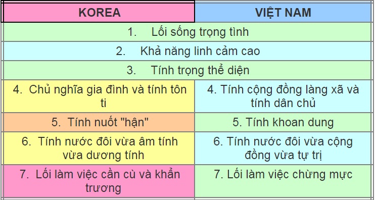 Hệ thống tính cách của hai dân tộc Korea và Việt Nam có những nét tương đồng và dị biệt như sau: