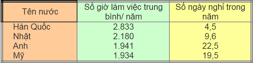 Số giờ làm việc và ngày nghỉ trong năm của công nhân một số nước vào những năm 80
