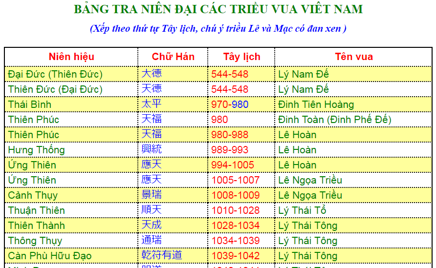 Untitled Published at 892 × 549 in Bảng tra niên đại các triều vua Việt Nam theo dương lịch Chia sẻ: Chia sẻ trên X (Mở trong cửa sổ mới) X Chia sẻ lên Facebook (Mở trong cửa sổ mới) Facebook Thêm Gửi email một liên kết cho bạn (Mở trong cửa sổ mới) Email Thích Đang tải...