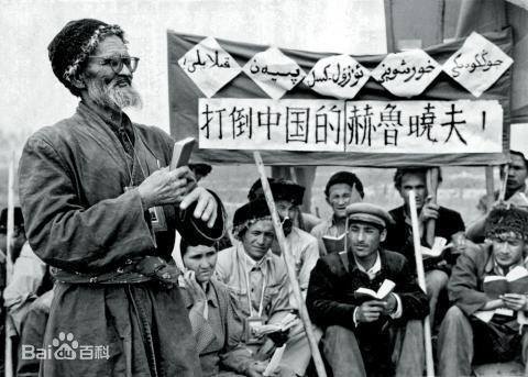 Người dân Tân Cương biểu tình với dòng chữ: ”Đả đảo bọn Khruschev của Trung Quốc” (ý nói chỉ trích các lãnh đạo Trung Quốc xét lại) trong sự kiện Ita năm 1962.