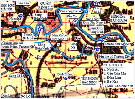 Những cái tên còn lại như Chi Giang (VĐULT), Ninh Giang (VSL) hay sông Chi Ninh (ĐVSL), nếu kết hợp đối chiếu với bản đồ khu vực của trận Bình Lỗ (Hình 2) [8] có thể giải thích như sau: Chi Giang trong VĐULT cũng là do chép nhầm chữ hữu (友) thành chữ chi (支), đúng ra phải là Hữu Giang, có nghĩa là nhánh sông bên phải. Cái tên sông Hữu Ninh trong TUTA cũng có nghĩa là nhánh sông bên phải, tức bên phải của sông Ninh. Còn Ninh Giang trong VSL và ĐVSL, theo nhà Hà Nội học Nguyễn Vinh Phúc [9], thì nó chính là một cái tên cũ của sông Cầu ngày nay. Như vậy Chi Giang (VĐULT) trên thực tế vẫn là con sông Hữu Ninh trong TUTA.