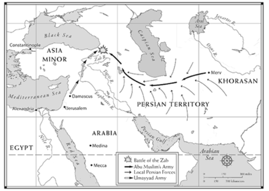 Vào năm 750 CN , quân đội hắc bạch chạm trán nhau trên bờ Sông Great Zab ở Iraq. Mặc dù bị áp đảo về quân số, chiến binh áo đen đánh tan tác các lực lượng đế chế, và vị kha-lip cuối cùng của triều đại Umayyad phải bỏ chạy thoát thân, tìm đường đến Ai Cập; trong năm đó, các đặc vụ Abbasid săn lùng ông ta ở đó và sát hại ông
