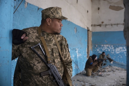 Tuesday, March 15, 2022 Ukraine, the international brigade squad trains in an abandoned wasteland. Handling of the equipment, movement in hostile environment, reorganization of the tactical bags.