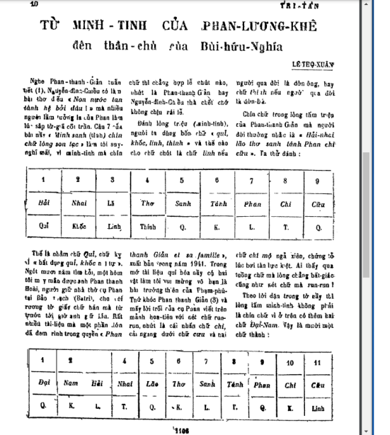 [30] Một lần nữa, xin coi bảng vẽ của tác giả trong bài viết mà người viết kèm theo trong hình chụp dưới đây để so sánh với bảng vẽ của ông Trần Khuê. Người viết chép lại để cho thấy cách tác giả xếp đặt theo thứ tự từ trên xuống, là: số, chữ, Quỷ Khốc Linh Thính