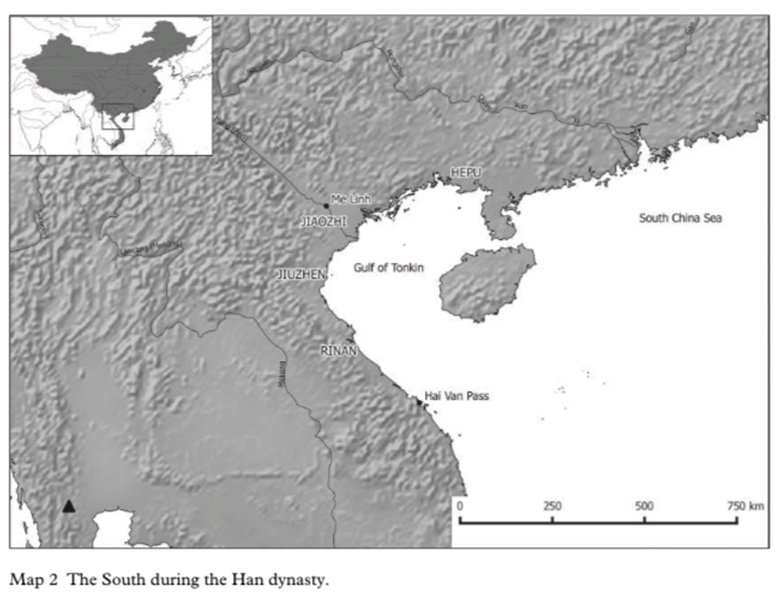 Nhận xét: Có vẻ hơi tùy tiện khi dùng ba thứ ký hiệu ngôn ngữ để ghi địa danh trên một bản đồ: Gulf of Tonkin…, Jiaozhi…., Hai Van Pass…. Gọi vùng biển quốc tế bằng tiếng Anh “South China Sea” giúp mọi người nhận ngay ra khu vực địa lý nào thì tạm chấp nhận được. Gọi Hợp Phố trên đất Trung Hoa ngày nay là Hepu thì chấp nhận được. Nhưng nếu gọi Mê Linh là Me Linh và đèo Hải Vân là Hai Van Pass trong khi biến Giao Chỉ, Cửu Chân, Nhật Nam thành Jiaozhi, Jiuzhen, Rinan thì rất khó chấp nhận. Theo chúng tôi, địa danh trên đất Trung Hoa ngày nay nên phiên theo Pinyin, địa danh trên đất Việt Nam ngày nay nên ghi theo tiếng Việt, dù không bỏ dấu. Ở đây, tuy địa danh được trình bày thiếu sáng sủa nhưng người xem vẫn hiểu, riêng việc thể hiện thời Hán có cửa quan tên Hai Van hoặc vịnh biển tên Tonkin thì khó bào chữa cho tác giả.