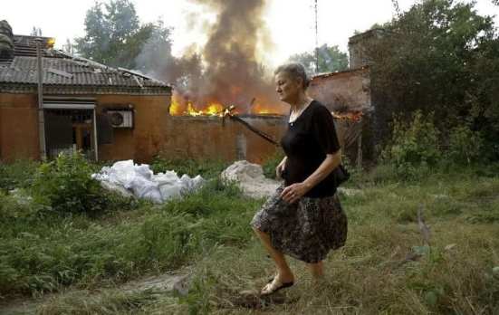 Ảnh: Một ngôi nhà bốc cháy sau khi bị pháo kích ở khu vực do quân ly khai kiểm soát ở Donetsk, ngày 3/6.