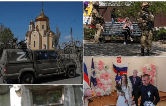 Một người trước đây là người dọn dẹp được giao phụ trách văn phòng đăng ký đám cưới của thành phố, nơi bây giờ có cờ Nga bay bên ngoài. Lễ cưới đầu tiên dưới thời chiếm đóng đã diễn ra ở đó, với sáu cặp đôi kết hôn dân sự trong nền nhạc của bài quốc ca Nga. Có ít nhất hai cặp trong sáu cặp đôi này đã kết hôn từ trước, ba người biết họ trước đó cho biết.