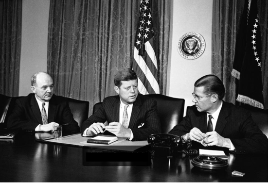 Các lãnh đạo, từ trái qua: Dean Rusk, Kennedy, McNamara
