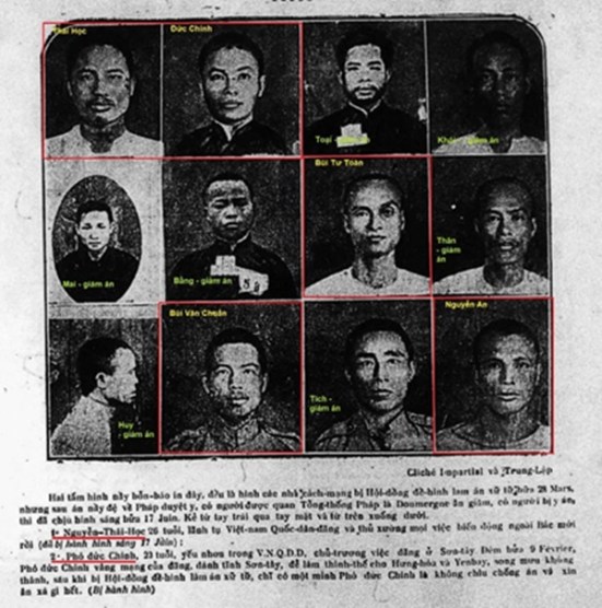 - Trong 13 bức ảnh nhỏ, chỉ có 7 ảnh là đúng (xem hình). Lý do: Phụ Nữ Tân Vănsố 58 đưa một số (không đầy đủ)ảnh của 39 người bị kết án tử hình tại Hội đồng Đề hình Yên Bái 2. Sau đó, tổng thống Pháp ân xá, giảm án cho 26 người. Trong số ảnh đã công bố, có 7 người không được ân xá.