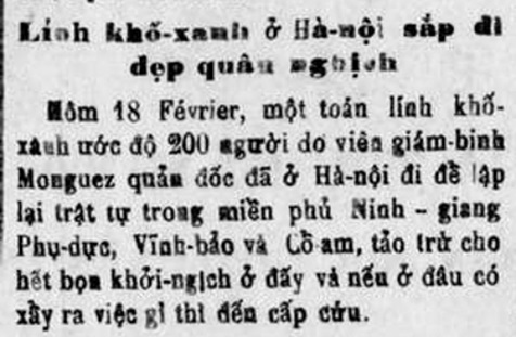- Trung hòa Nhật báo 865 (20/2/1930) đưa tin: “[18/2] Lính khố-xanh ở Hà-nội sắp đi dẹp quân nghịch” (xem hình). Ơ hay, ông Vi Văn Định đã “kiện toàn” từ ngày 17/2 rồi kia mà? Có thể đưa ra hàng chục ví dụ khác để chứng minh sự “viết liều” của tác giả.