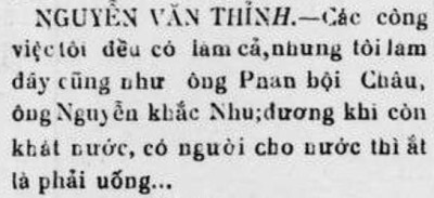 Không rõ khi báo chí đưa lời này thì ông Nguyễn Ngu Í và TK có còn giữ quan điểm của mình không: “Các công việc tôi đều có làm cả, nhưng tôi làm đây cũng như ông Phan Bội Châu, ông Nguyễn Khắc Nhu; đương khi còn khát nước, có người cho nước thì ắt là phải uống…” (Nguyễn Văn Thịnh trả lời trước Hội đồng Đề hình Yên Bái 1 – Thực nghiệp Dân báo 2780, 4.3.1930, xem hình)