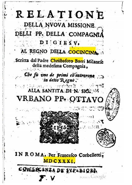 Borri C. 1631a. Relatione della nvova missione delli PP. della Compagnia di Giesu al Regno della Cocincina. Roma: Per Francesco Corbelletti.