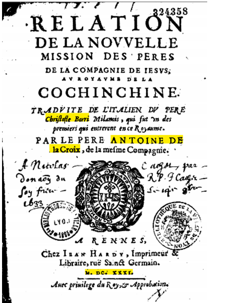 Borri C. 1631b. Relation de la Nouvelle Mission des Pères de la Compagnie de Jésus au Royaume de la Cochinchine. Bản tiếng Pháp của A. de la Croix. Rennes: Chez Iean Hardy.