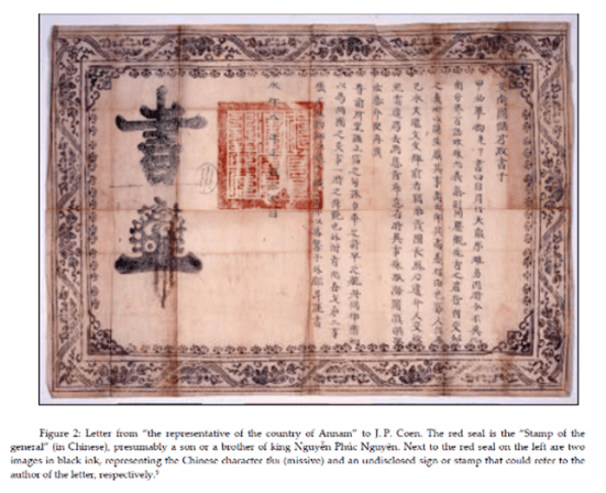 Thư của Nguyễn Phúc Kỳ (安南國儲君致書于 An Nam quốc trữ quân trí thư vu) gửi J.P. Cohen năm 1626, hiện được lưu trữ ở Central Library of Leiden University. Nguồn: Kleinen J. 2011.