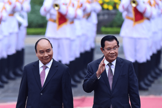 Kể từ năm 2015, chính phủ Campuchia đã giải quyết vấn đề nhạy cảm về mặt chính trị và ngoại giao của người Việt Nam nhập cư bất hợp pháp thông qua các phương pháp như cung cấp giấy tờ, trục xuất, trục xuất, di dời và đăng ký. Trong ảnh này, Thủ tướng Campuchia Hun Sen (R) và người đồng cấp Việt Nam khi đó là Nguyễn Xuân Phúc (L) duyệt đội danh dự trong lễ đón tại Phủ Chủ tịch ở Hà Nội ngày 4 tháng Mười 2019. Ảnh: Nhac NGUYEN / AFP.