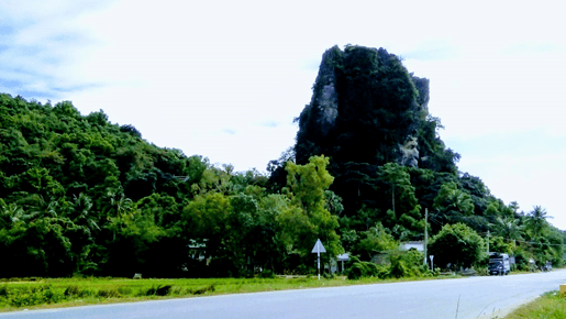 Quang cảnh Thạch Động mặt tây, ở mặt nầy ta thấy hình mặt người ta bằng đá trên sườn núi. (Hình : PhamKhang, năm 2018)