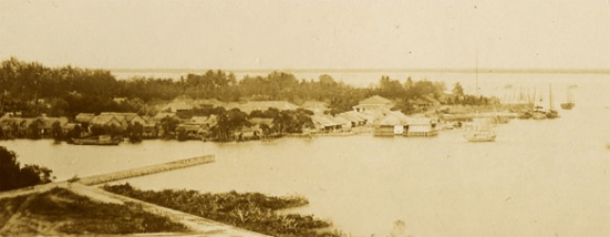 Quang cảnh phố Hà Tiên vào năm 1902 nhìn từ Pháo Đài, ảnh sưu tầm. Bên trái hình cho thấy có rất nhiều căn nhà gỗ cất trên sông, đó là « Venise d’Hatien » như bác sĩ Morice đã mô tả. Ngày xưa đó là đường « Cầu Câu » (Pont en bois), không phải là đường Cầu Câu mới sau nầy. Hình sưu tầm trên mạng.
