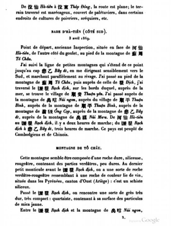 Một trang trong tác phẩm « Géologie de l’Indochine: Anatole Petiton, Paris, 1895 », đoạn nói về Hà Tiên, tác phẩm do Google chuyển sang tài liệu số (scanner).