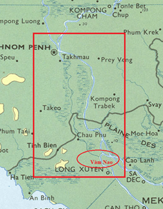 | Hình 7: Bản đồ J. Thornton (1701) ghi sông Onbequame từ Vàm Nao ngược lên Campuchia | Hình 8: Bản đồ Indochina Hypsometry (1970) vẽ đoạn Vàm Nao – Phnom Penh là khúc sông hẹp |
